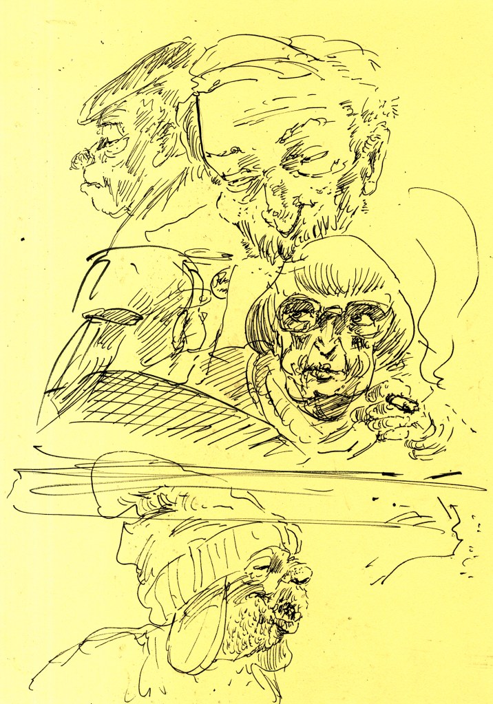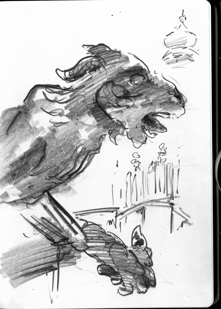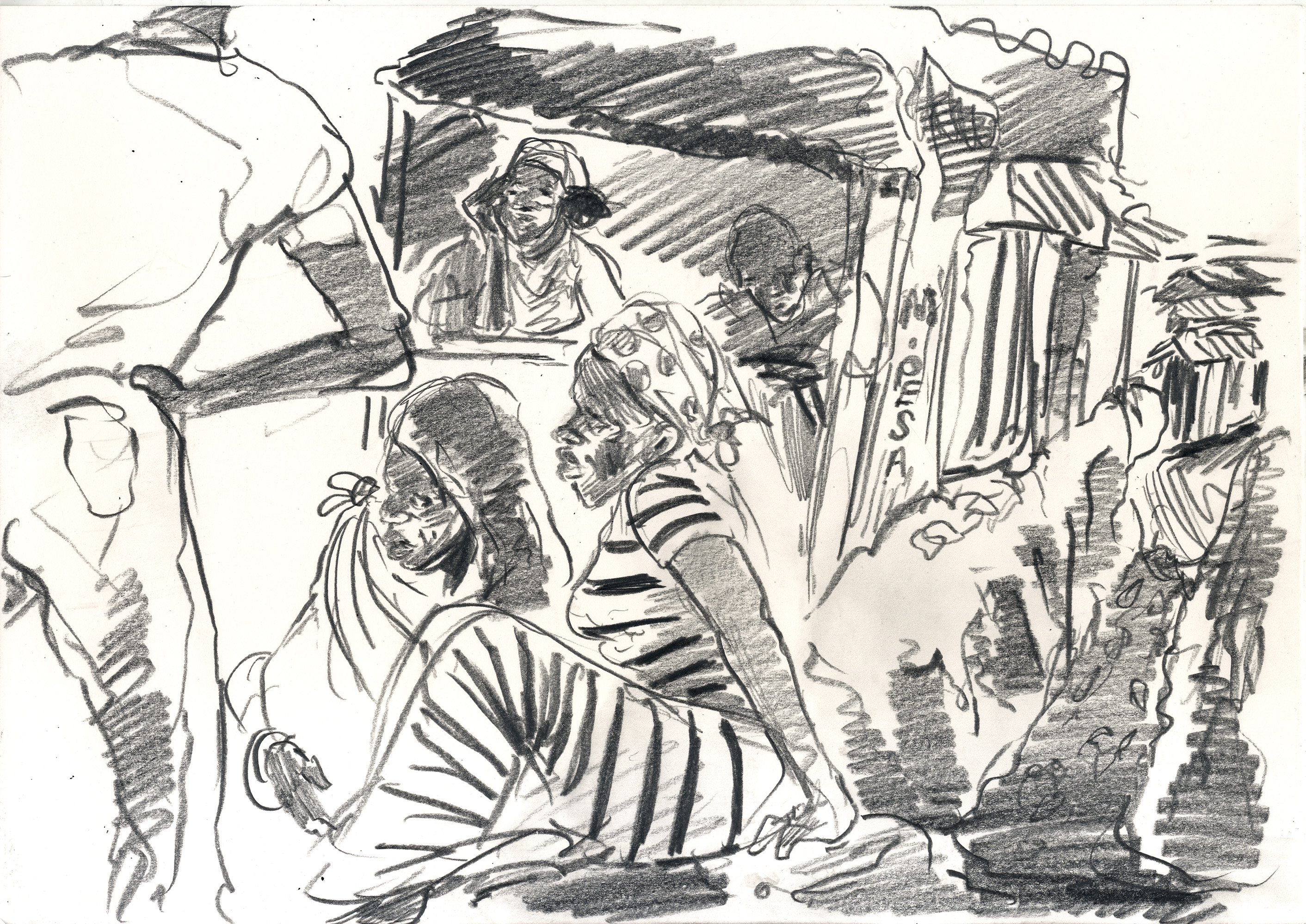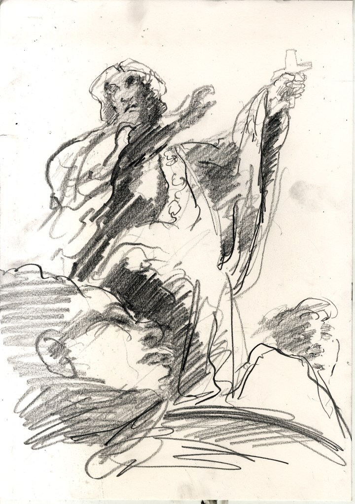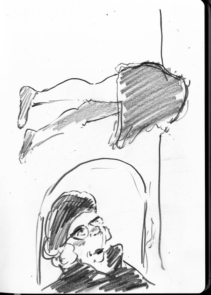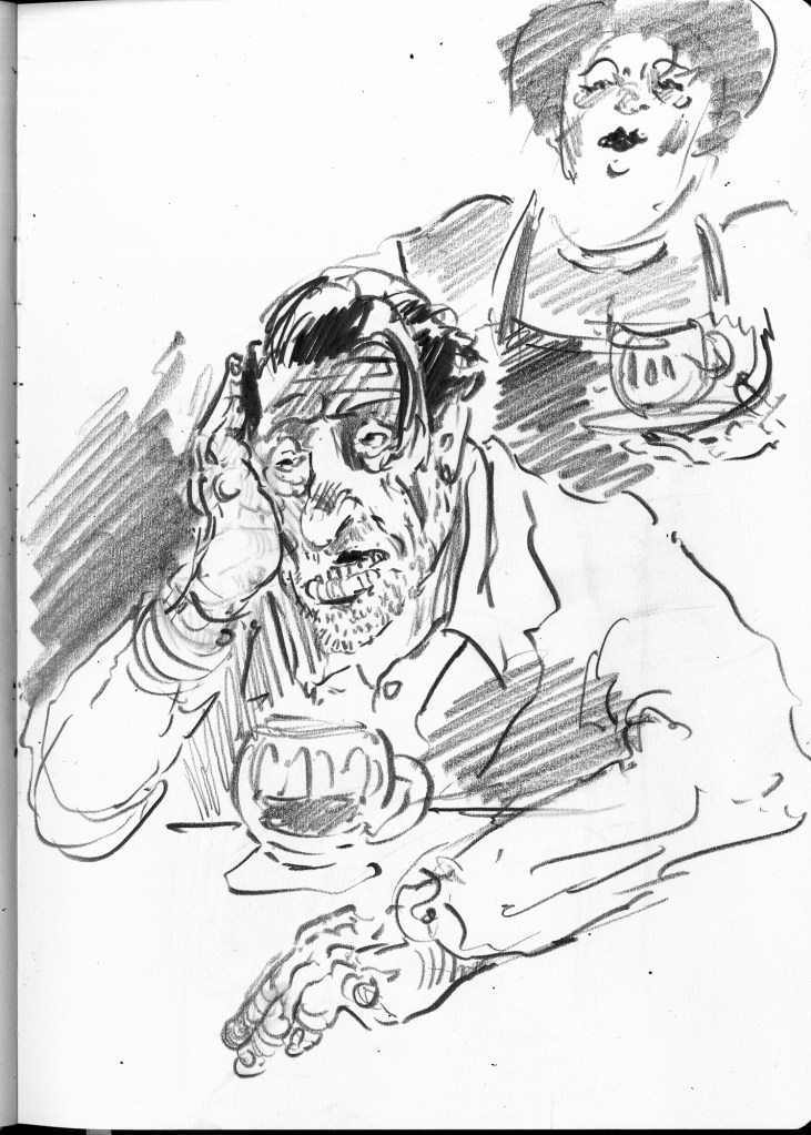 Enjoy the drawing below. For me these drawings bring back so much more than just snapshots or memories. They are containers filled with lives that I may have drawn but I don’t control. They are also not fixed. They are living out these small dramas somewhere in some space. If the drawings don’t somehow connect to a seen and witnessed thing or person they do not work. They reflect the amount of information I was able to preserve, within my own limitations of skill or memory, on the page in marks and lines and smudges. Drawing is a conjuring up, a construction which is built on instinct and foolish confidence. When it works it has captured that same crackle of life that was witnessed, some remnant of life passing, not frozen or preserved but captured and held in the dreamscape of a piece of paper.