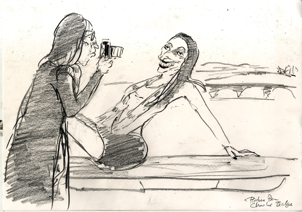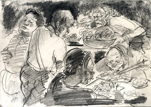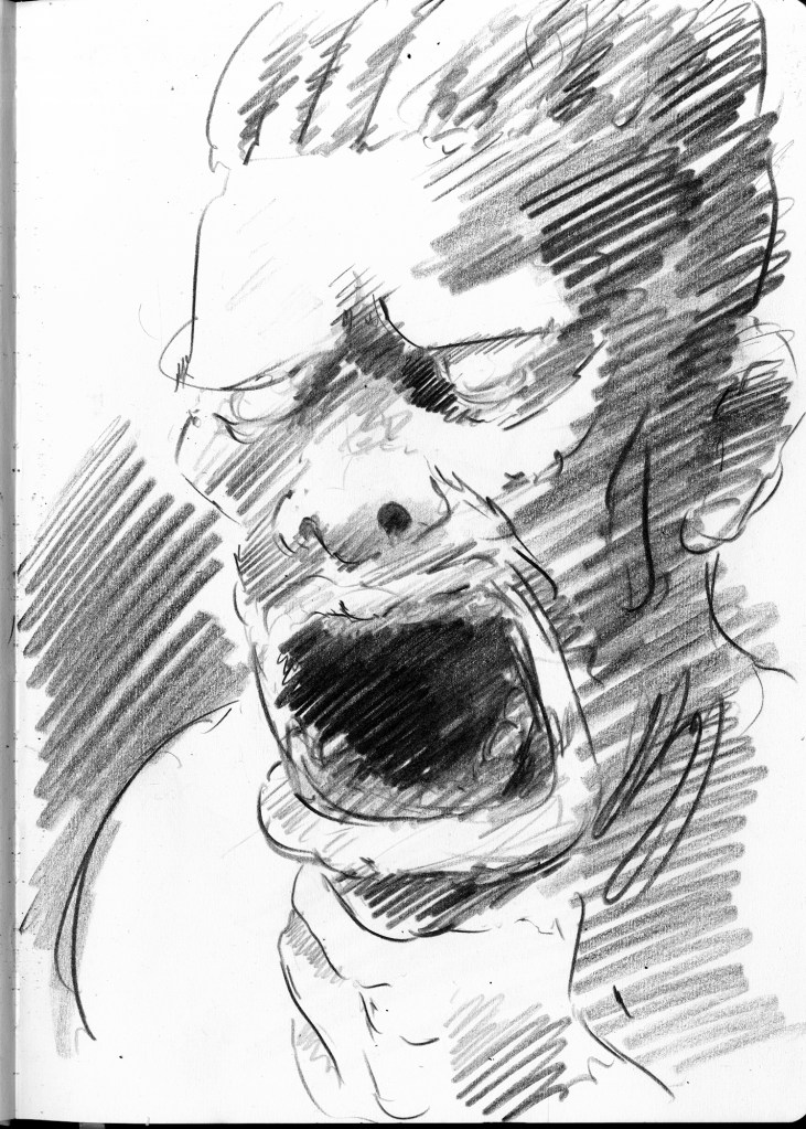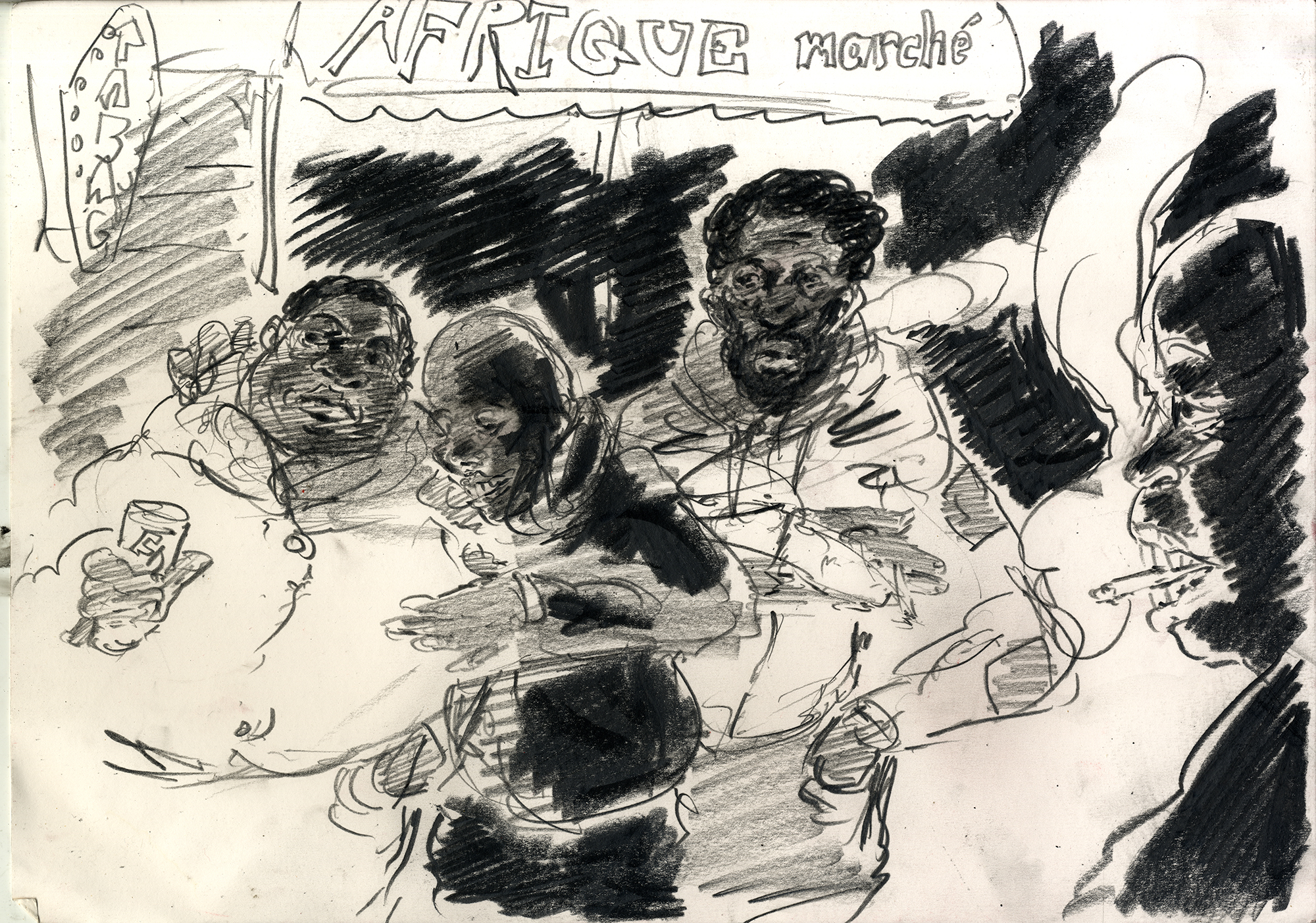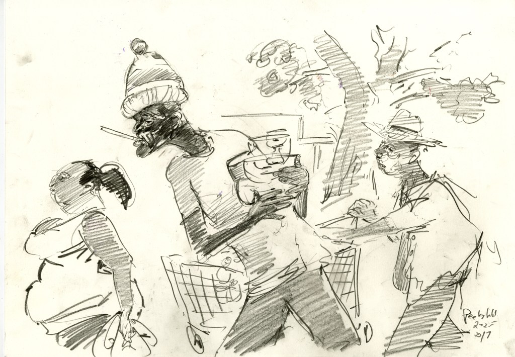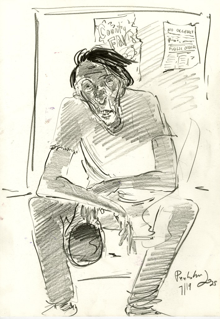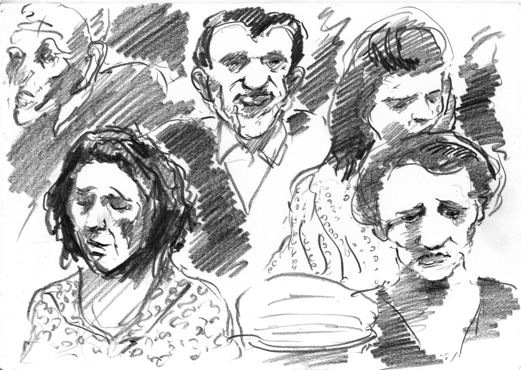 Enjoy the drawing below. For me these drawings bring back so much more than just snapshots or memories. They are containers filled with lives that I may have drawn but I don’t control. They are also not fixed. They are living out these small dramas somewhere in some space. If the drawings don’t somehow connect to a seen and witnessed thing or person they do not work. They reflect the amount of information I was able to preserve, within my own limitations of skill or memory, on the page in marks and lines and smudges. Drawing is a conjuring up, a construction which is built on instinct and foolish confidence. When it works it has captured that same crackle of life that was witnessed, some remnant of life passing, not frozen or preserved but captured and held in the dreamscape of a piece of paper.