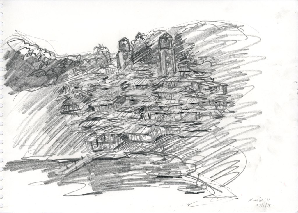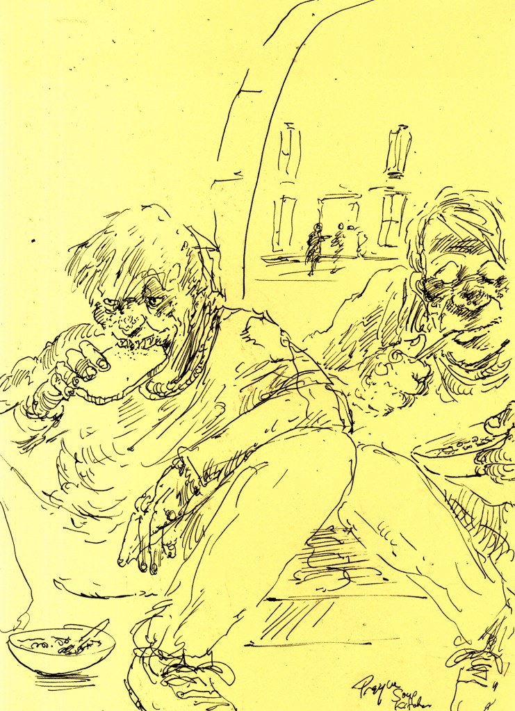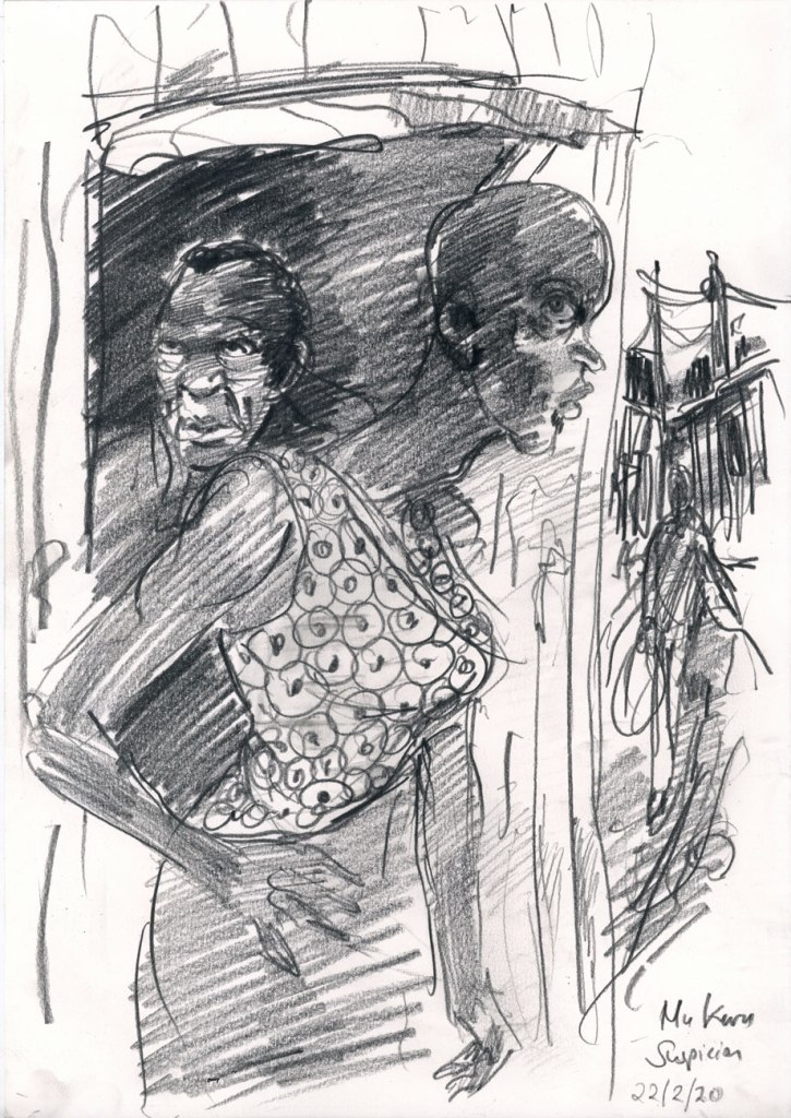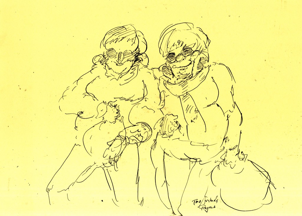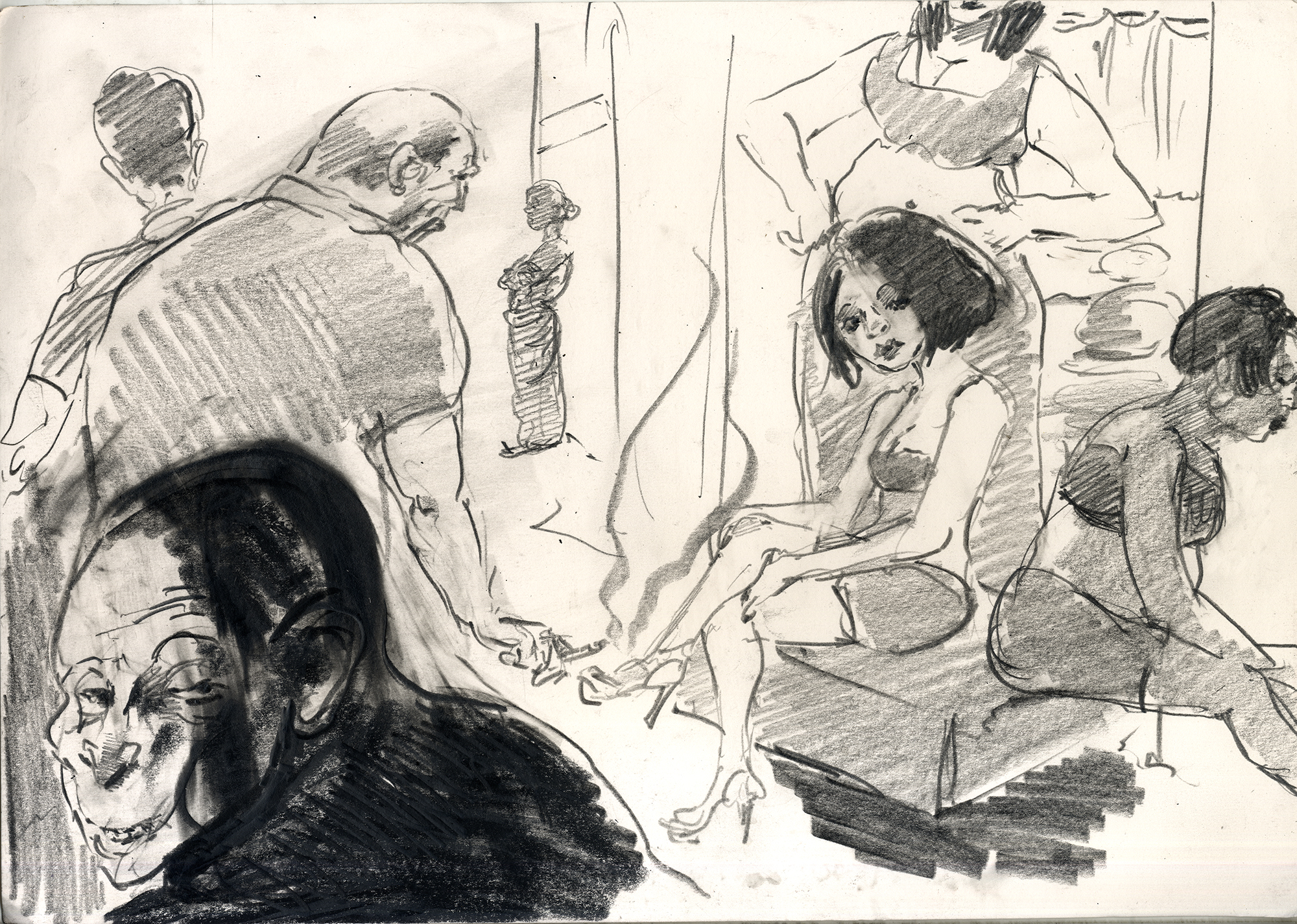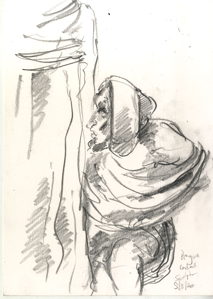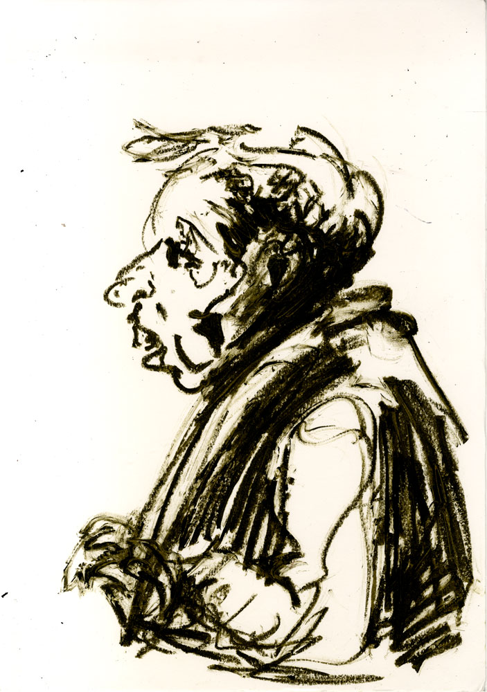 Enjoy the drawing below. For me these drawings bring back so much more than just snapshots or memories. They are containers filled with lives that I may have drawn but I don’t control. They are also not fixed. They are living out these small dramas somewhere in some space. If the drawings don’t somehow connect to a seen and witnessed thing or person they do not work. They reflect the amount of information I was able to preserve, within my own limitations of skill or memory, on the page in marks and lines and smudges. Drawing is a conjuring up, a construction which is built on instinct and foolish confidence. When it works it has captured that same crackle of life that was witnessed, some remnant of life passing, not frozen or preserved but captured and held in the dreamscape of a piece of paper.