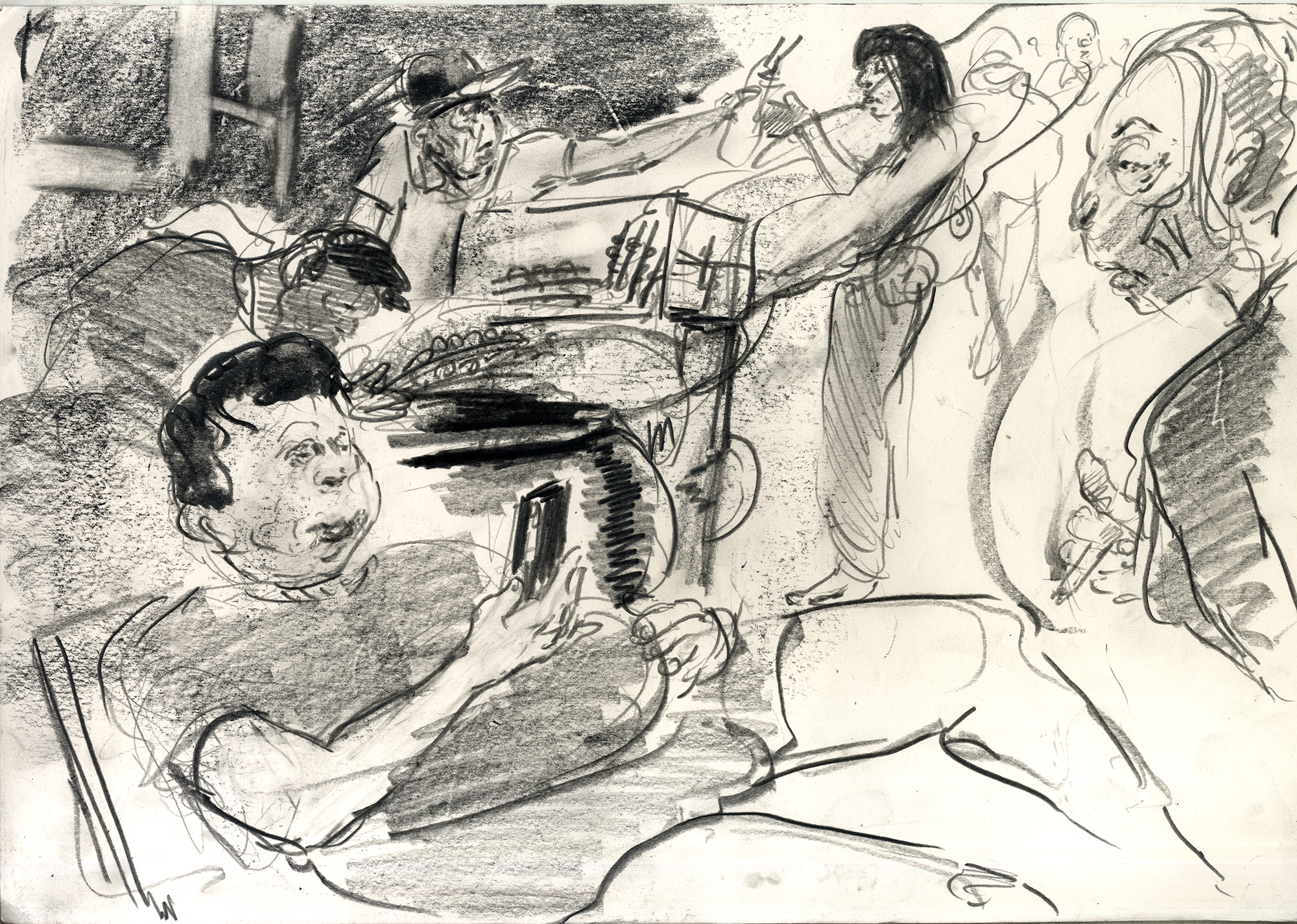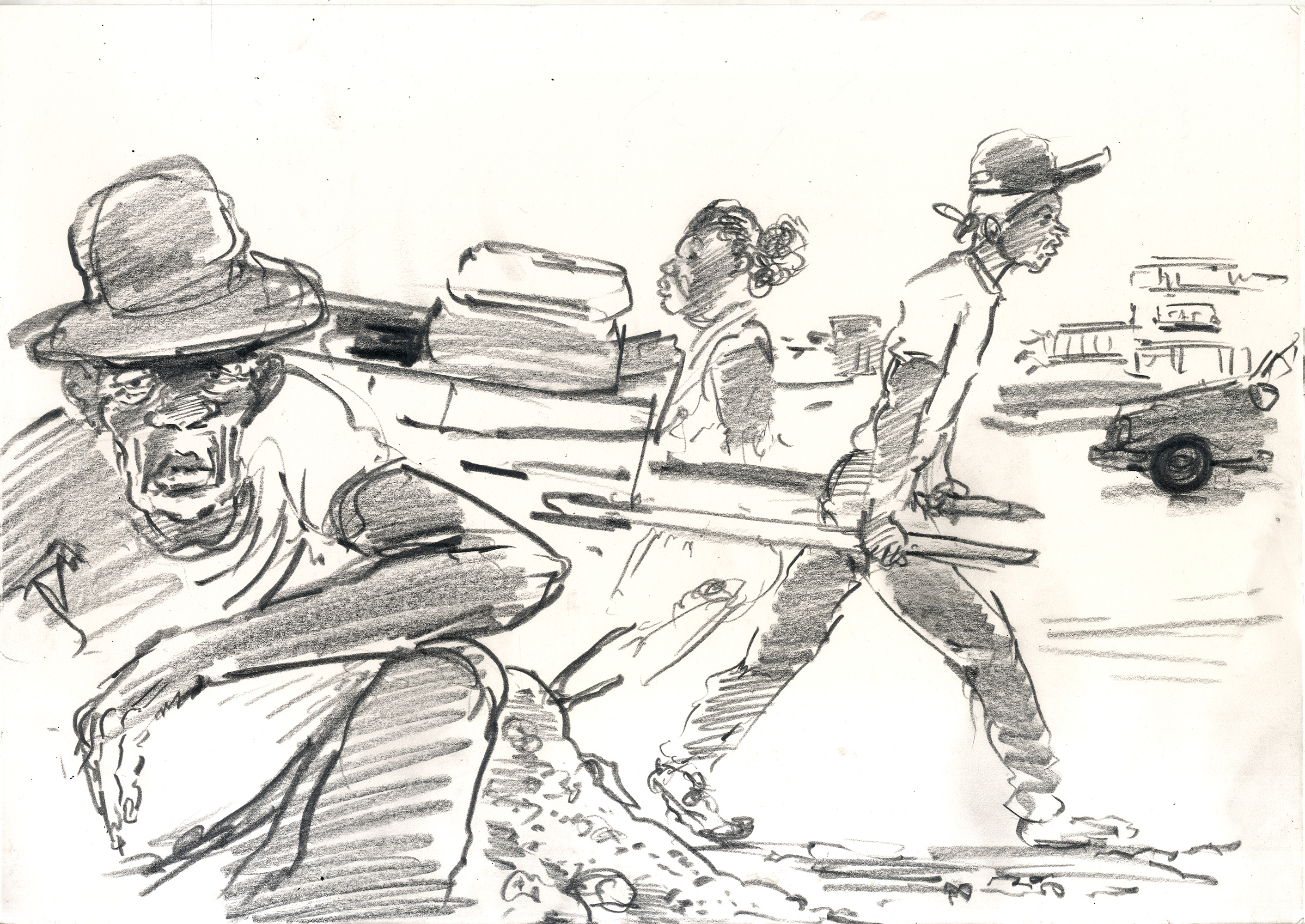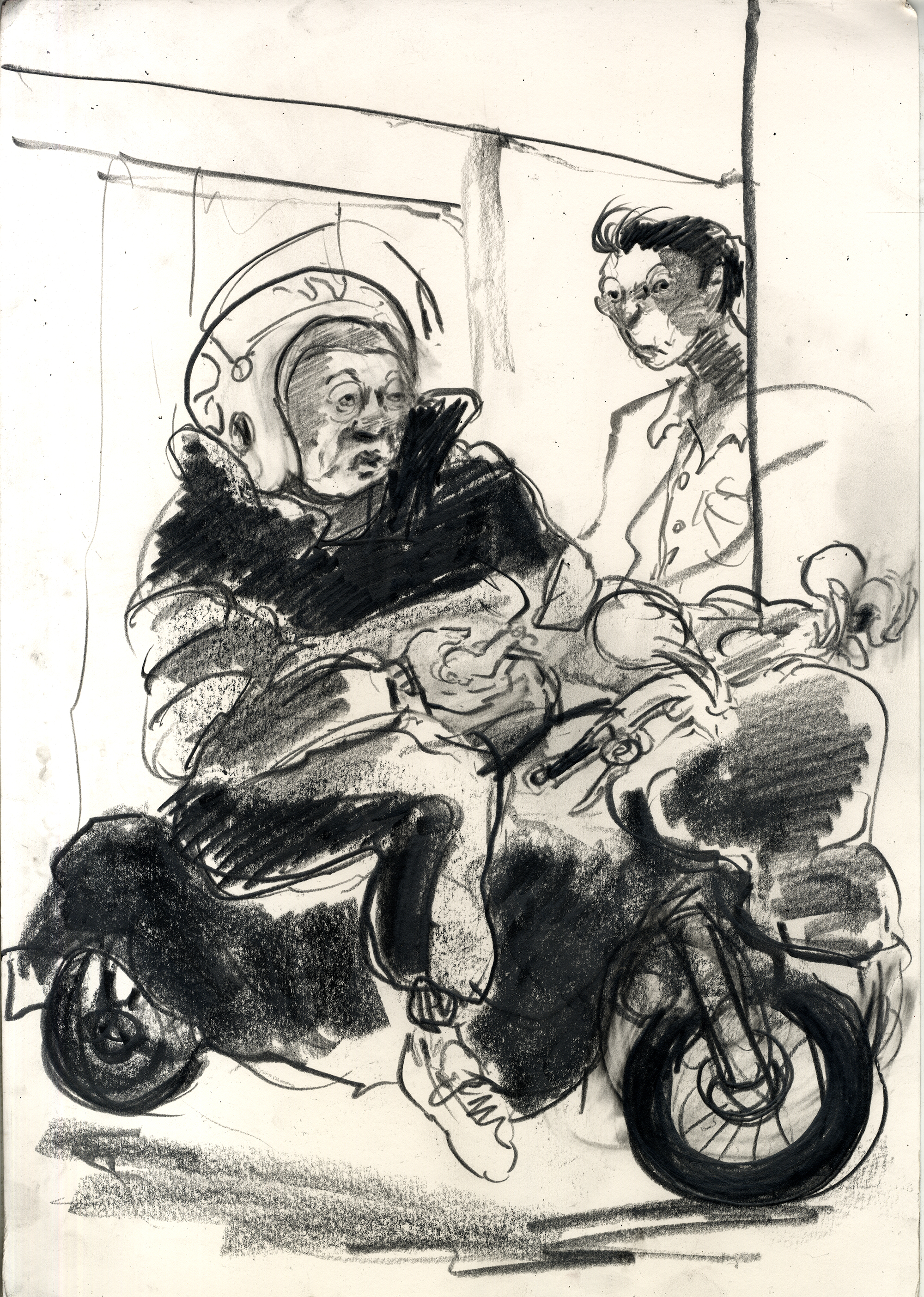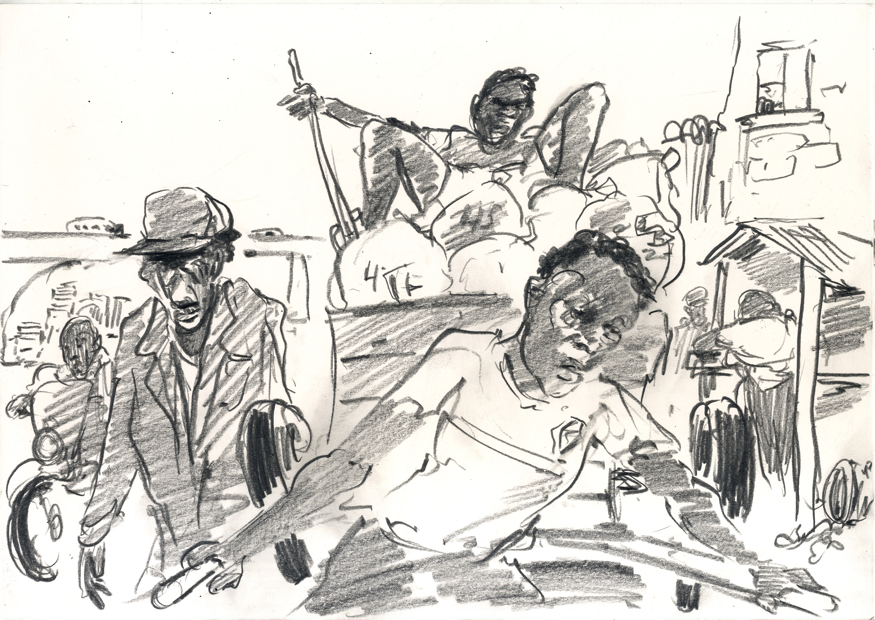 Enjoy the drawing below. For me these drawings bring back so much more than just snapshots or memories. They are containers filled with lives that I may have drawn but I don’t control. They are also not fixed. They are living out these small dramas somewhere in some space. If the drawings don’t somehow connect to a seen and witnessed thing or person they do not work. They reflect the amount of information I was able to preserve, within my own limitations of skill or memory, on the page in marks and lines and smudges. Drawing is a conjuring up, a construction which is built on instinct and foolish confidence. When it works it has captured that same crackle of life that was witnessed, some remnant of life passing, not frozen or preserved but captured and held in the dreamscape of a piece of paper.