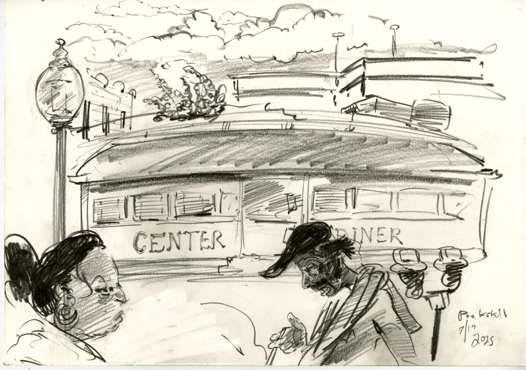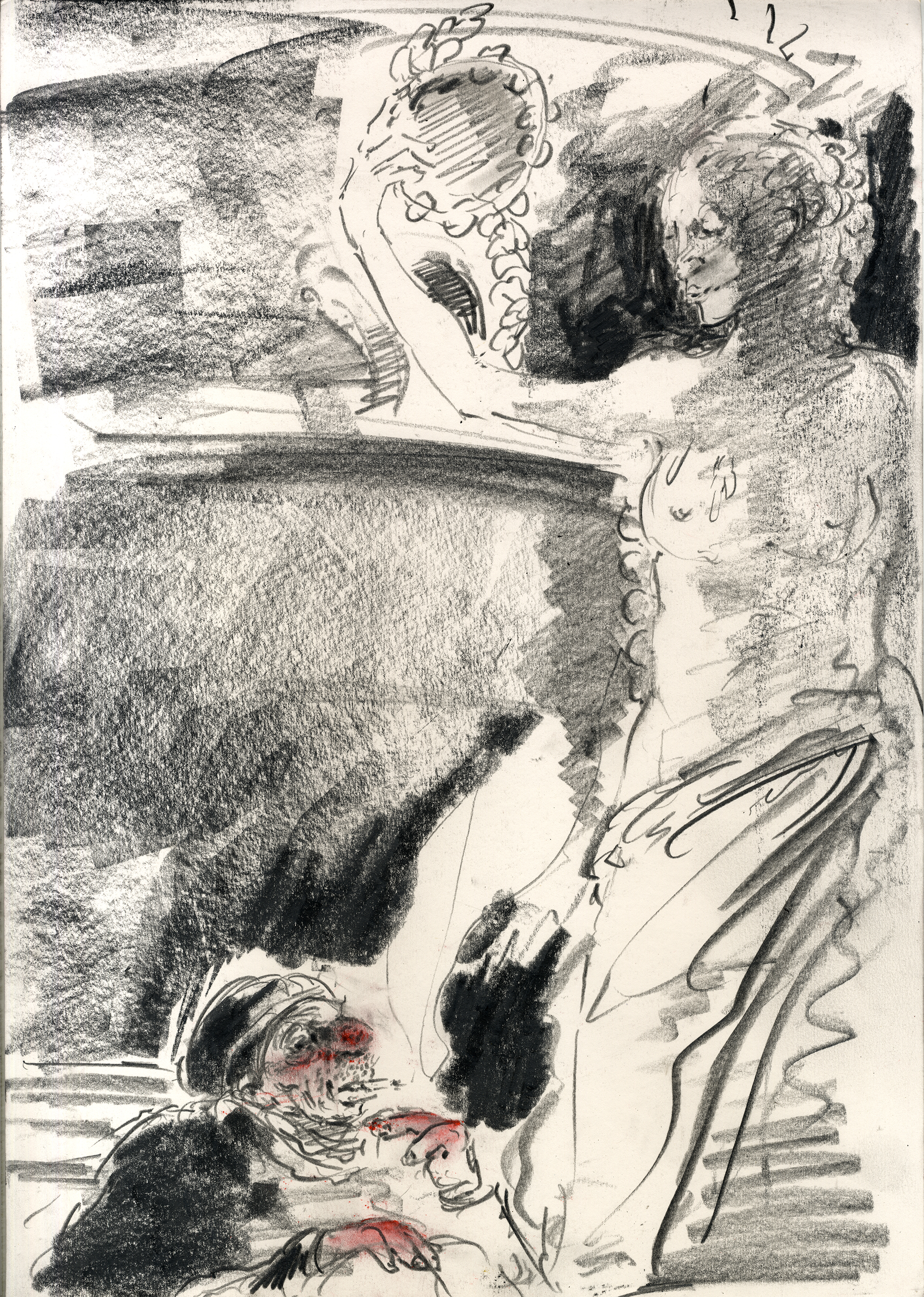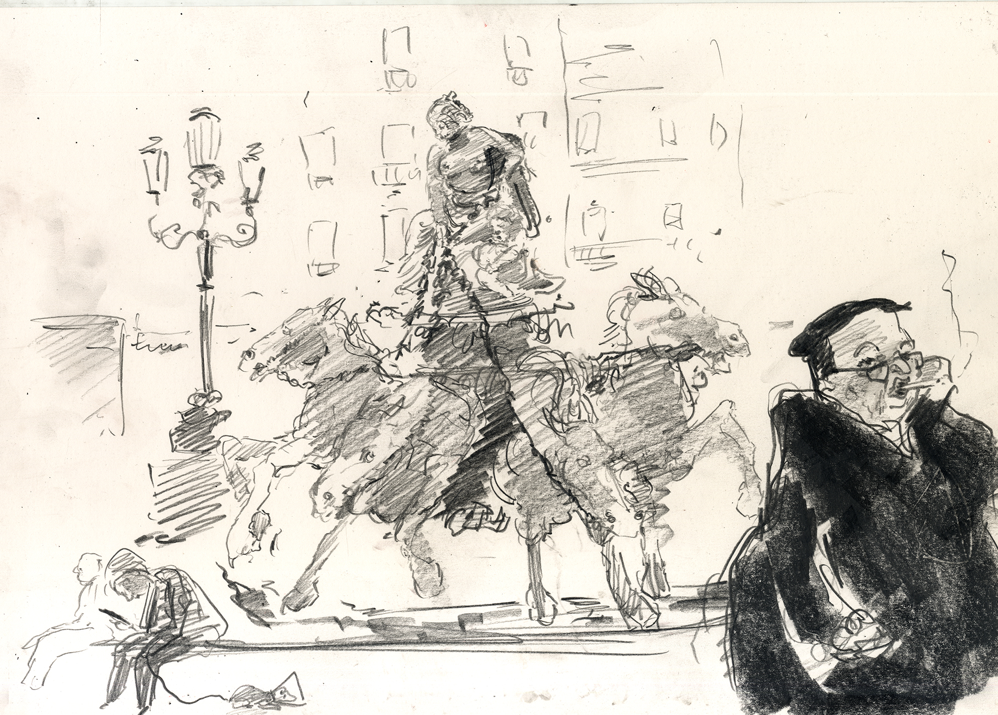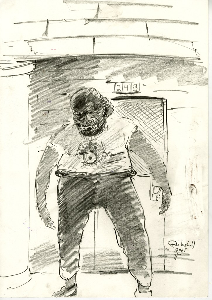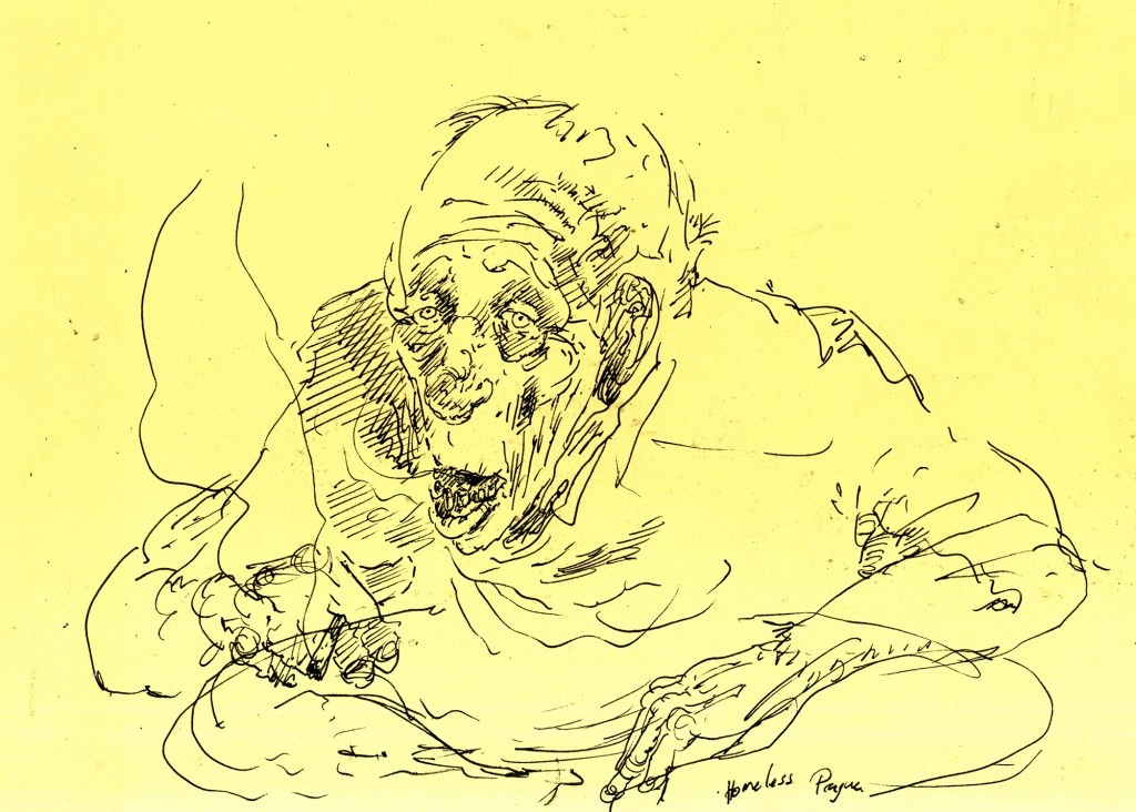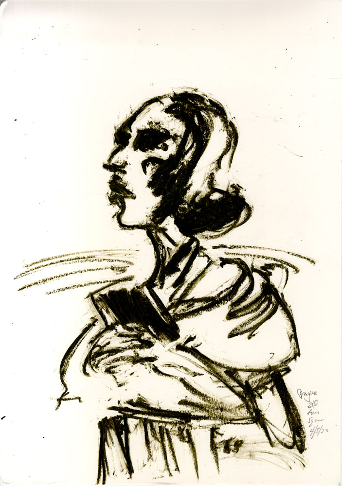 Enjoy the drawing below. For me these drawings bring back so much more than just snapshots or memories. They are containers filled with lives that I may have drawn but I don’t control. They are also not fixed. They are living out these small dramas somewhere in some space. If the drawings don’t somehow connect to a seen and witnessed thing or person they do not work. They reflect the amount of information I was able to preserve, within my own limitations of skill or memory, on the page in marks and lines and smudges. Drawing is a conjuring up, a construction which is built on instinct and foolish confidence. When it works it has captured that same crackle of life that was witnessed, some remnant of life passing, not frozen or preserved but captured and held in the dreamscape of a piece of paper.