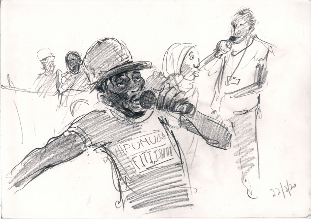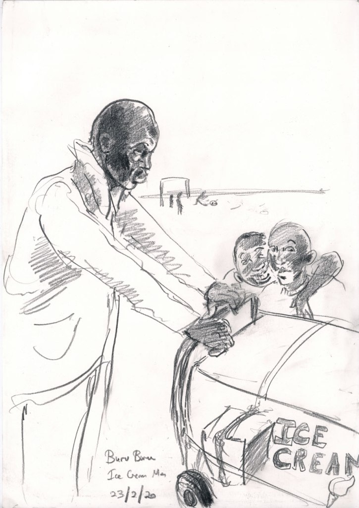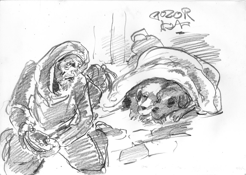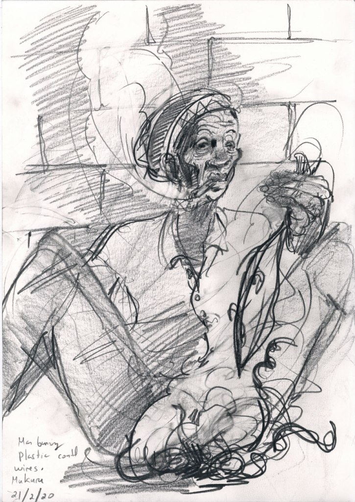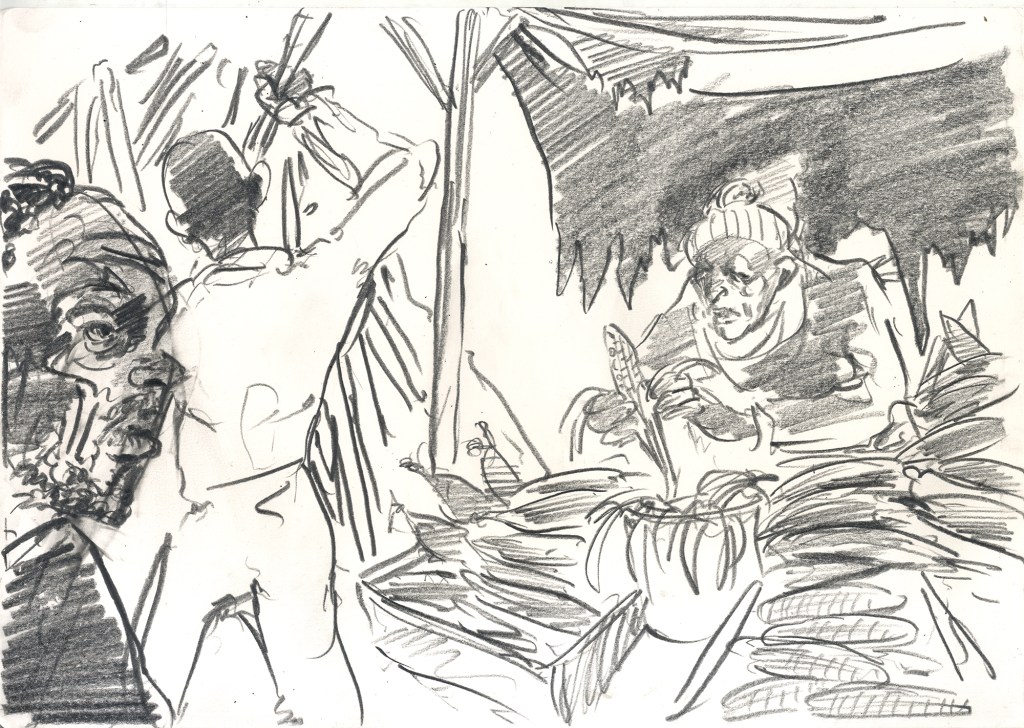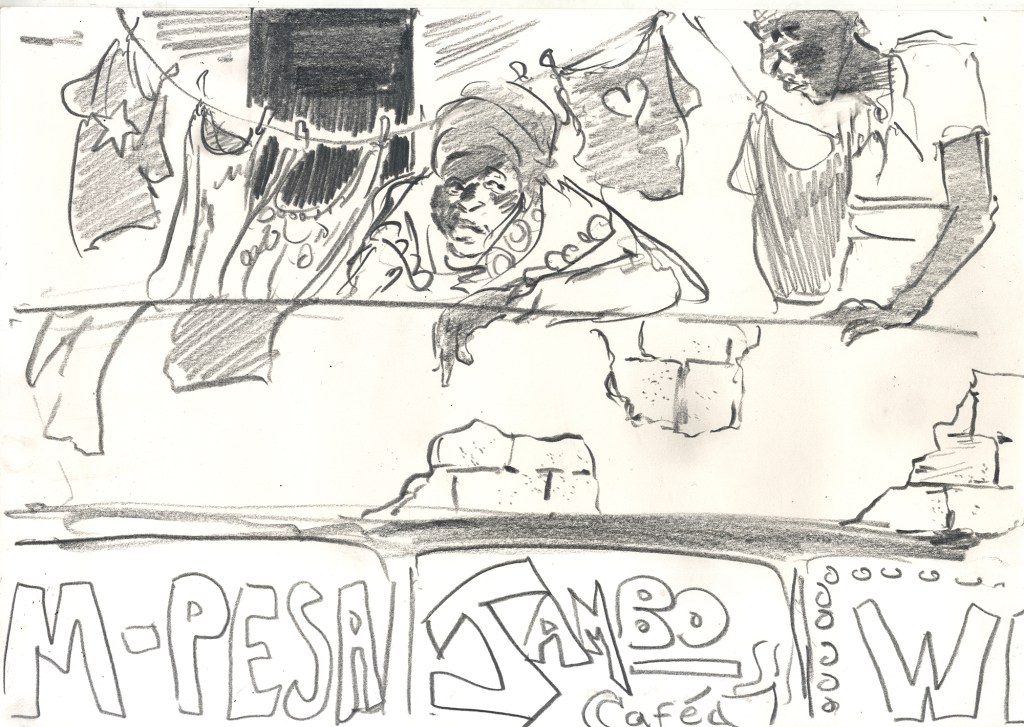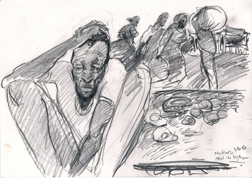 For a week in October I was lucky enough to be in the south eastern city of Mombasa in Kenya. Having been working in Nairobi on a research project regarding lung health (see previous posts) I was familiar with Kenya. Mombasa however is very different from Nairobi. For one, it is very hot and not a dry heat, a heavy, humid, tropical heat that I typically don’t enjoy. In Mombasa however, I was loving it. Besides a teenage trip to Mexico, I had not been in a tropical climate like this and was in love with my surroundings that were teeming with life. Colourful lizards, monkeys, bats, crabs and camels were all around and twitching in the background, sometimes seen, sometimes not. I was part of the communication package of a research project on heritage and resilience in South Sudan. We worked in a nice air conditioned room on various parts of project. Evenings became a ritual of drawing by the beach and inevitably being harassed by trinket sellers for whom I was easy pray, packing my bag full of their wares and probably over paying for them all. I realised that I could happily live by the beach. It brings a tremendous sense of calm and doing this reportage drawing with a clear head and time on my hands was a genuine luxury. After doing one drawing of a trinket seller I had just encountered named Abdul, I met an older German woman named Margaret who loved my drawing and proceeded to tell me all about her life. I kept running into her and she kept effusively telling me how much she loved the drawing. I eventually gave it to her and you can see her below with my drawing back home with her in Germany. She had also run into Abdul herself and was then especially happy with the drawing as, according to her, it looked just like him.