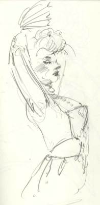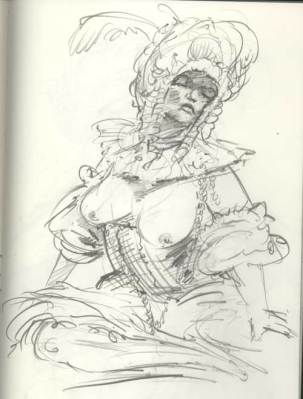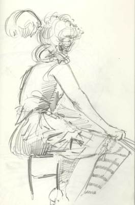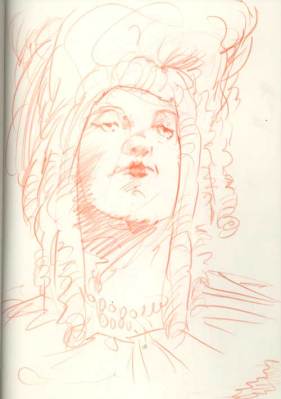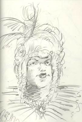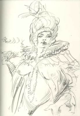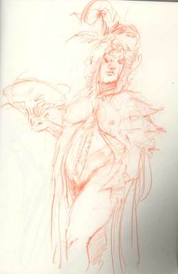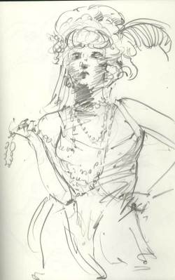 Every Thursday at the Society of Illustrators in NYC they have a costumed drawing session. This wonderful event in the magnificent society building is packed with seasoned and beginning artists. The tone was serious but breaks were relaxed with drinks and great conversation. The models were in Elizabethan garb. I couldn’t help but wonder how this decadence with it’s over the top dress and ornaments, was some flamboyant alarm for the impending collapse of the aristocracy (at least as an open institutional power). The same hubris of Wall Street (without the fancy dress) pointed to a collapse but again, we refused to see it. It seems denial is more seductive than reckoning. After the drawing session, I was walking the streets and noted another celebration of decadence, the opening of the latest Sex and the City movie. Like the wealth parade of the Elizabethan era, the Sex and the City girls flaunt excess and even shallow self involvement. Although all of this may seem out of sync with the times, in a city like New York, there are still plenty of people with plenty of money. You can bet when things get a little better, they will be back on the streets with their fancy dress and decadent displays, the scale of which we can only imagine. Well, minus the wigs of course.