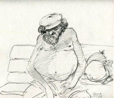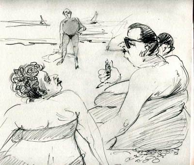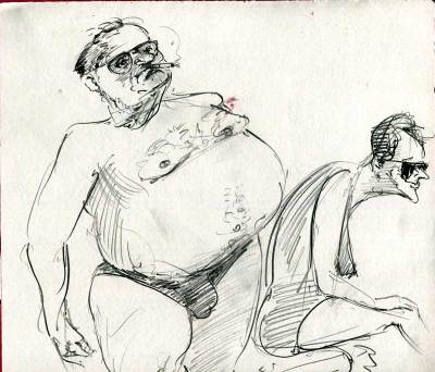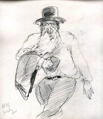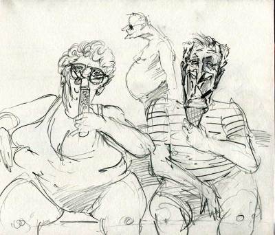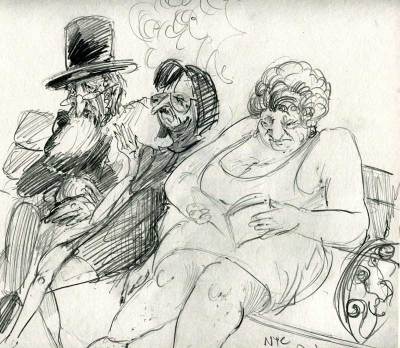 These drawings are from Southsea, the Isle of Wight and New York City. As diverse as these places are, there is the common thread of summer pastimes. For many, especially New Yorkers, the idea of free time is foreign so every moment of vacation/holiday is precious. Still, the ultimate goal of time off is to relax and when people let their hair down, I like to be there with pencil in hand. There is also something apolitical in my drawings this summer. Instead of my typical posture of ridicule and sneering cynicism, I feel real sympathy for my subjects, especially the Americans who have had a rough 3 years with economic doom at every corner. I realized as well that Americans are big hearted and kind people. It is a shame that the political face of the nation and our foreign policy has put the ugly american forward, resulting in its true nature going unseen by much of the world. True there are still the nutcase right wingers and people with old hate in their hearts but much of that can be written off to pure ignorance and people pushed to the edges of society. The recent anniversary of 9/11 reminded me of course of the heartbreaking tragedy of the day but also, how proud I felt to be in a country that, when pushed to the brink, would take care of its own. It was a brief moment when America restored it’s moral place in the world, not by political action, but by honest to goodness citizenship. With so much petty political turmoil today, Americans forget that the country was founded on the principal that the people are running the show. 9/11 showed that when push comes to shove, our better instincts, our bravery, and big hearts rule the day.