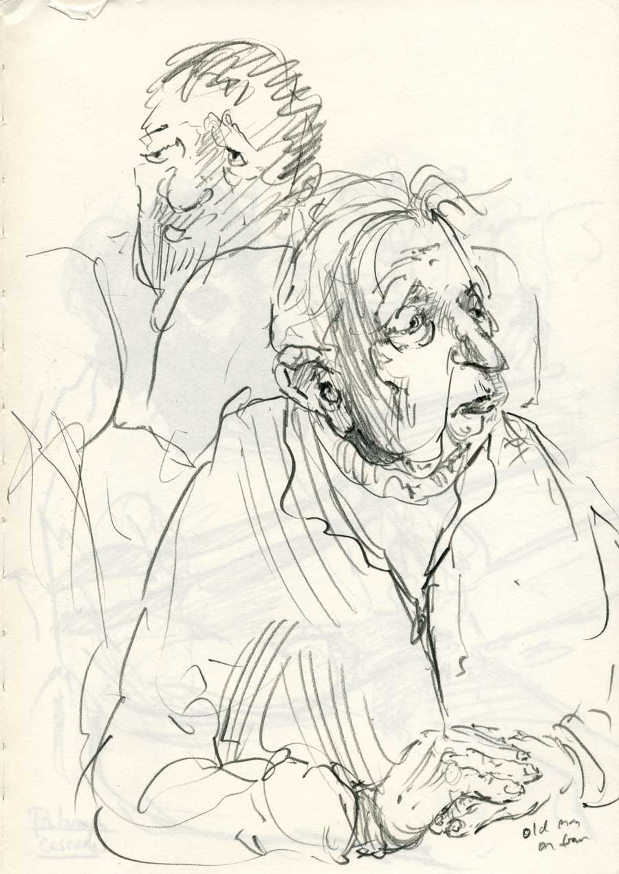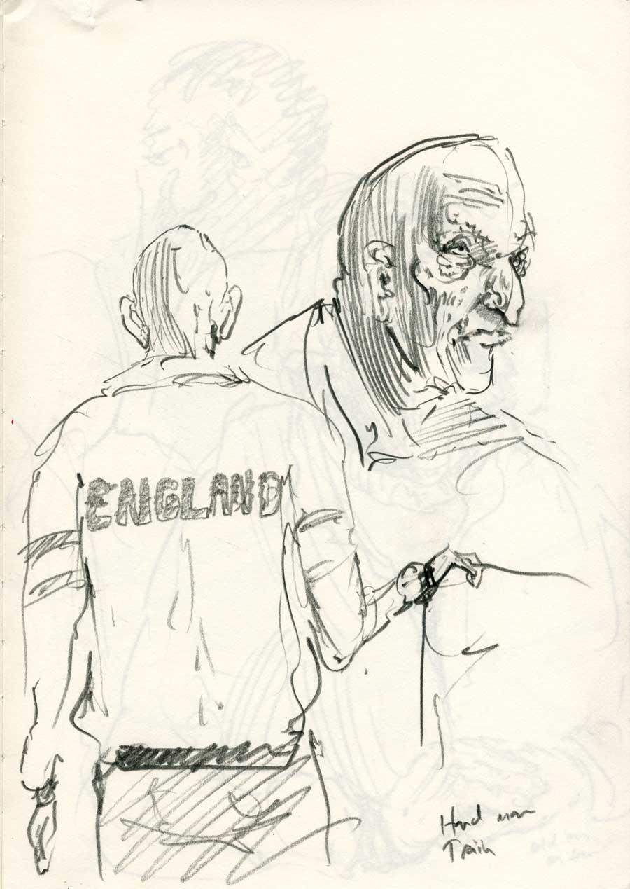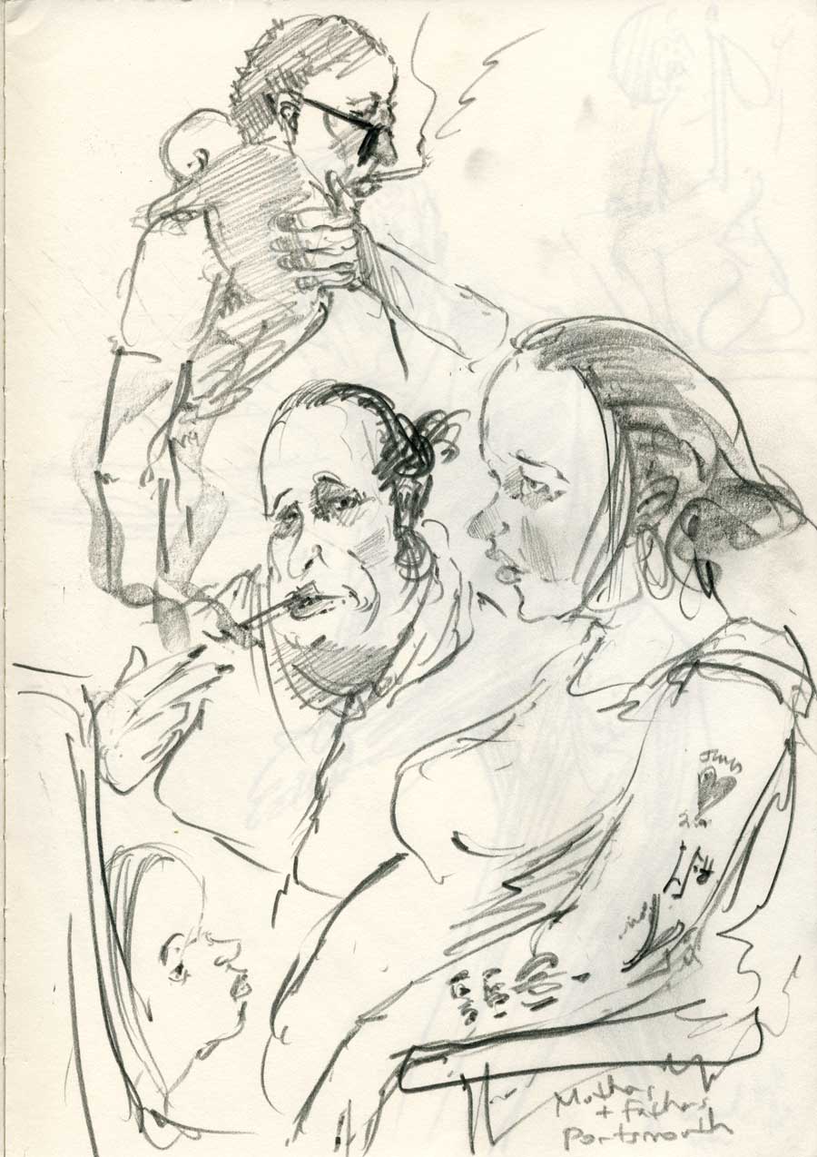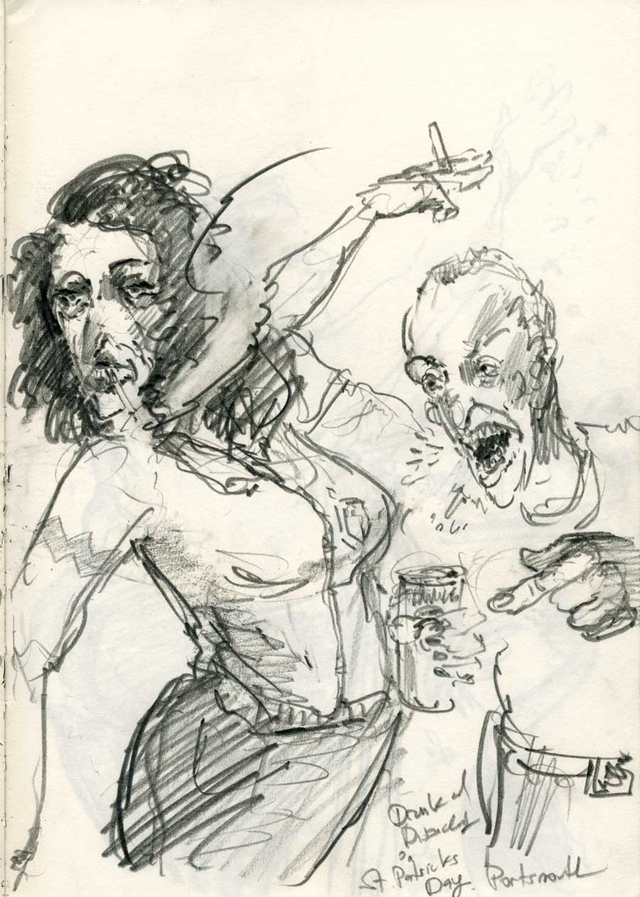 20 MarThese drawings are from my commute, Portsmouth and London. This collection of people were spotted in ordinary locations and playing out the routine of ordinary life. What they reveal is the remarkable theatre of the everyday that sees individuals and groups engaged in small and large dramas which inevitably, when drawn, have a distilled, symbolic weight. Out on the street we are always going somewhere else. I am mining the pavement to see if those transitory moments represent a kind of destination unto themselves. Perhaps drawing of this kind is a meditation on our time alone. Our time disconnected from origins and destinations where we confront our own thoughts among others similarly caught in transitory states. Enjoy!