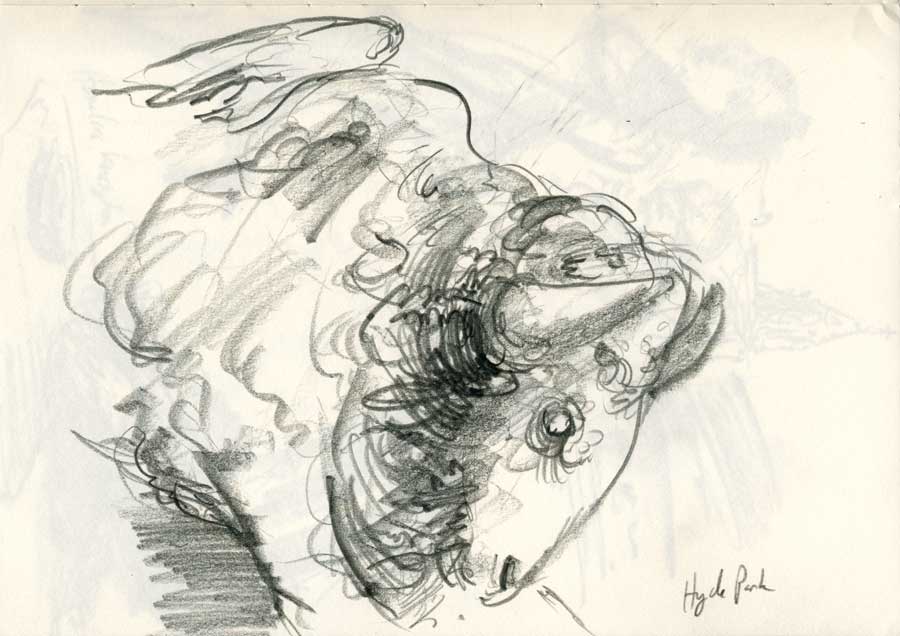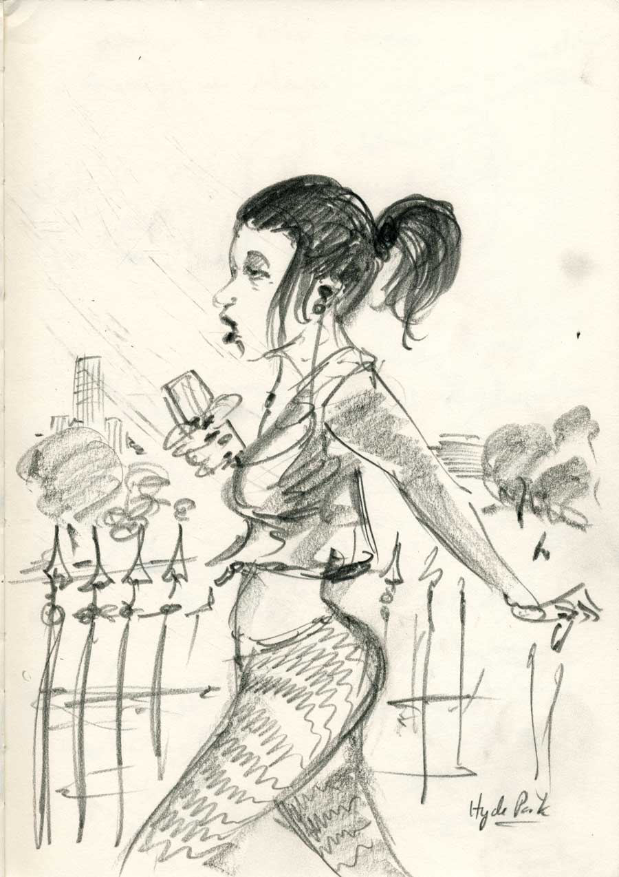 These are some drawings done in a few hours walking around London. Starting in Paddington station, I moved towards Hyde Park and then finished at the cafe at the Royal Albert Hall. The extended moment that we are privileged to see in drawing is particularly unique in the kind of reportage that I am practicing here. While these people are surely observed and did exist (in a form prior to their reshuffling in my mind) the drawings frame that moment in a combination of marks and a construction of an implied or explicit narrative. This narrative is often only available to the artist when the drawing is done or, in those temporal moments when the action of drawing merges with unfolding thoughts and deeply felt impressions. Drawings, like thoughts, shift and change and it is this flexibility that makes creative reportage a dialogue with place. While the drawings may depart wildly from the real and observed, they could not have come to be without the feedback received by looking, thinking and making. In fact, if there is something vital to drawing itself (even work that is not anchored in observation) it is the bristling, inexorable link to a world that means something to us. This commitment happens first when the artist sees either through observation or in the minds eye, a discernible truth. Those temporal passages that speak in a variety of layered, symbolic shorthand, are a declaration of affirmed belief. We believe because the artist believes. And so the storyteller wanders on.