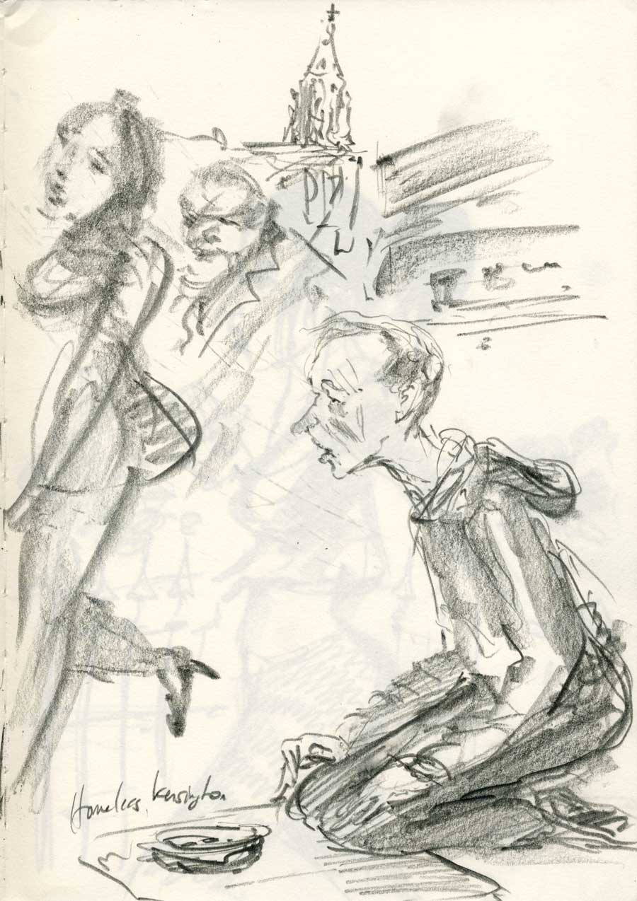 11 OctIf drawing is a visual language then it is certainly distinct in form and function to other languages. Every other language is concerned with the constituent parts. The letters, the words, the structures. Drawing is largely concerned with the end result. What is represented. We derive a host of meanings from how it is made and the strategies employed in rendering the forms but, the totality of the image is paramount. And it should be. Although not as brutal as having the magicians trick revealed, the analysis of drawing can make the drawing seem too determined, too constructed. But if we call drawing a language, we can also speak of the use of language in ways that are more poetic and befitting of an art object. Like language, drawing employs devices that challenge our assumptions and through a complex arrangement of developed notations (symbolic shorthand), the artist is speaking with a singular voice; more akin to spoken language with pitch and timing laid over the intended (or unintended) meaning of the words. Languages, like the places they reflect, have cultures and that is a compelling lens with which to see an artist’s world. A culture of one perhaps. Enjoy these drawings of London. More context for these characters to come. These are just people that called out to me.