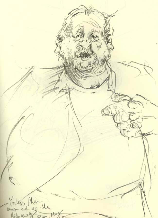 This is a collection of random drawings from the Westchester area and NYC. Looking at them brings back memories. Some are strange sightings from the corner of my eye as I am driving, others are close encounters. Either way it proves that when you are paying attention, it is a frightening world out there. New York in particular is always surprising. For me, the clash of the wealthy and the poor is always jarring. Those worlds don’t often mix but when they do they reveal the dirty little secret that the American Dream is a myth and that the poor have as much of a chance achieving their dreams as the rich do giving up their hard fought dominance. I am keeping this short because I have finally realized that drawing is enough.